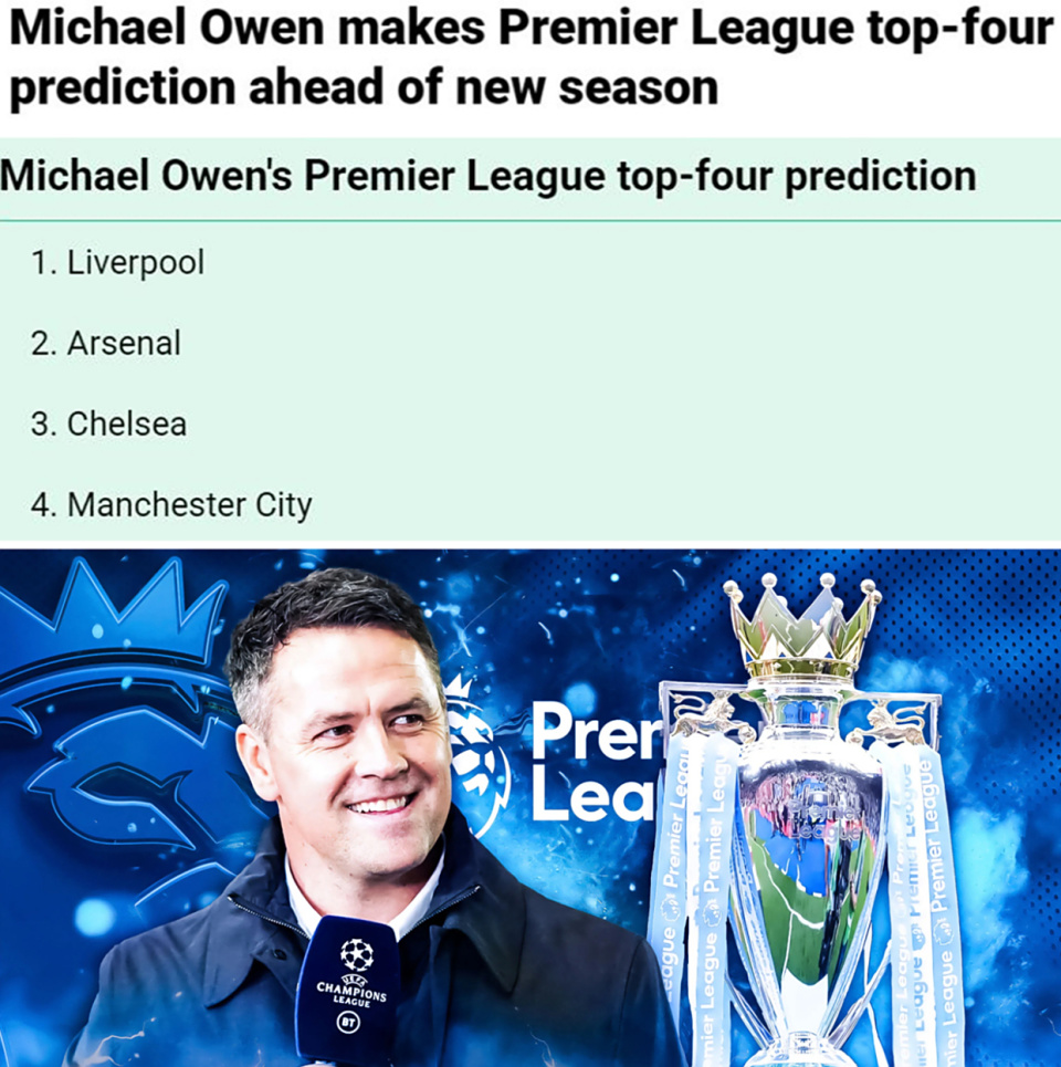 英国媒体地铁报报道,前英超球星欧文预测称,他相信自己的老东家利物浦可以卫冕英超冠军。欧文表示,他预期阿森纳会连续第四个赛季拿到英超亚军,切尔西和曼城则会在新赛季分列第三和第四。